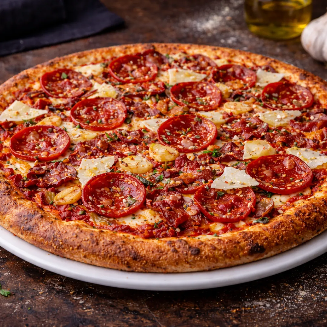 Pepperoni + bacon, bold, salty, satisfying.
