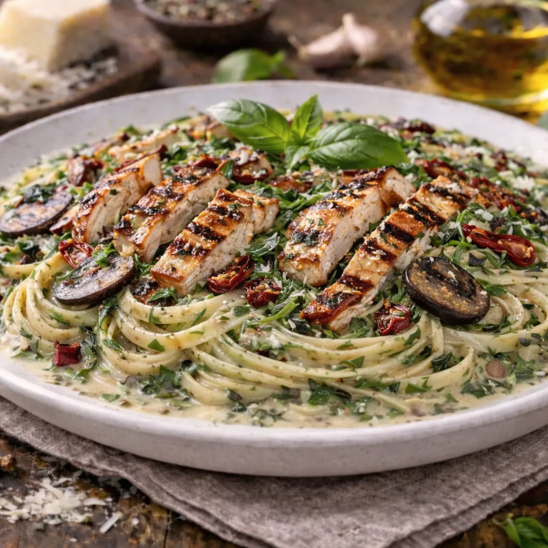 Pesto fettuccine, chicken, sundried tomato hit.